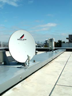 - パラボラはBS・CS用、向こう側の箱様の設備が地デジ用アンテナ。